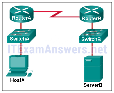 Refer to the exhibit. HostA is attempting to contact ServerB. Which two statements correctly describe the addressing that HostA will generate in the process? (Choose two.)