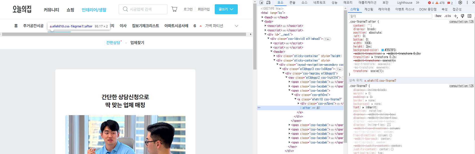 헤더 메뉴 아래에 Active를 나타내기 위해서 라인이 생기는 UI가 많은데, 오늘의 집에서는 이런 요소를 after로 만들어주고 있다.