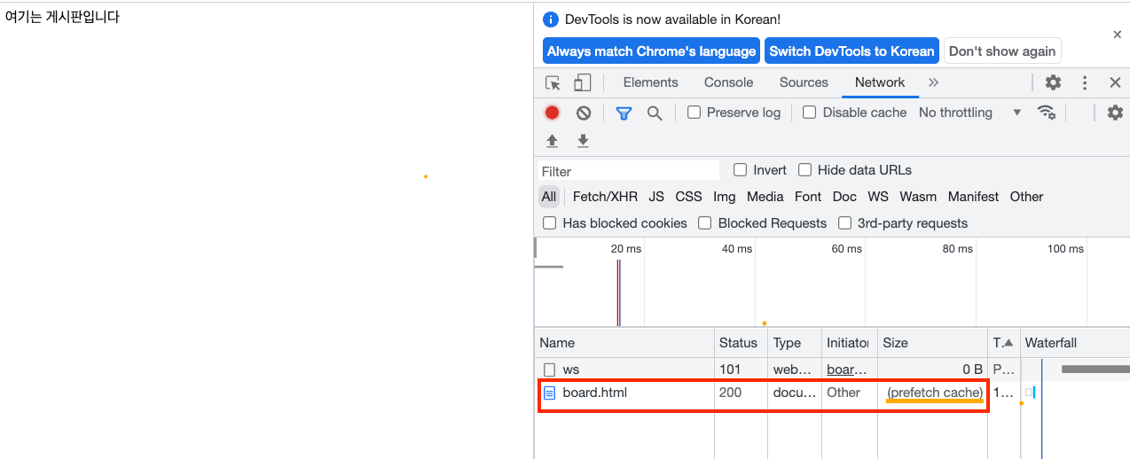 이를 통해 사용자가 링크를 클릭하여 다음 페이지로 이동할 때 로드 시간이 거의 없어 빠르게 페이지가 나타난다. 예를 들어, index.html에서 board.html을 prefetch하면 개발자 도구의 Network 탭에서 'Size: prefetch cache'로 표시되어, 캐시에 저장된 리소스를 로드하지 않아도 되는 것을 확인할 수 있다.