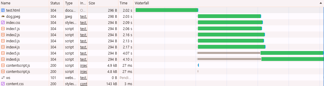 HTML 1.1 버전에서는 일반적으로 최대 6개의 리소스를 병렬로 다운로드하므로, 강아지 이미지가 다운로드 순서에서 밀려서 사용자가 해당 이미지를 보기까지 기다려야 할 수 있다.