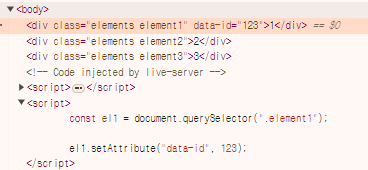 첫번째 요소를 querySelector를 통해서 가져오고 setAttribute를 활용해서 data-id 속성을 추가해줬다.