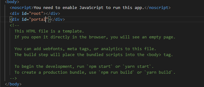 pubilc 폴더에 있는 index.html 파일의 root div 아래에 portal div를 한 개 추가해준다.