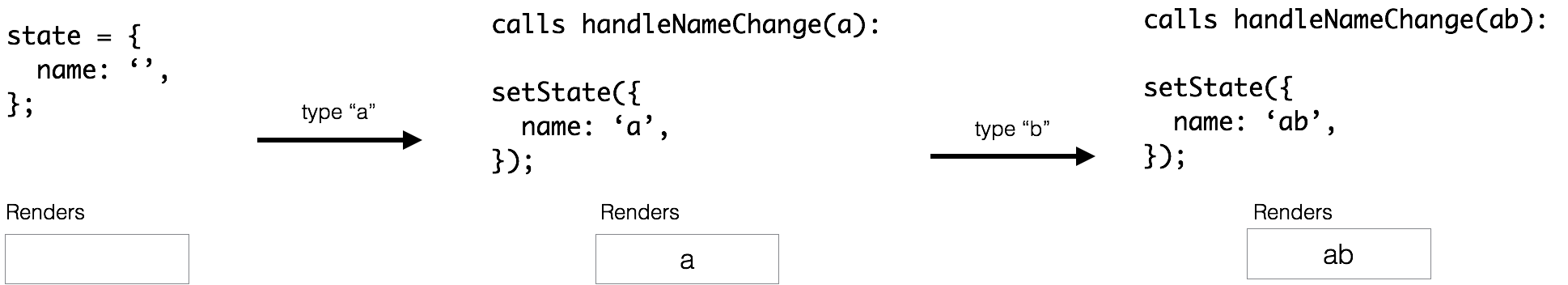 Input은 리렌더가 되고 value로 a를 가집니다. - 다시 b를 입력하면 handleNameChange는 ab를 받고 state를 설정합니다.