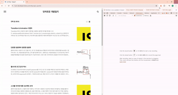 홈페이지를 스크롤 했을 때 16.7ms 마다 새로운 프레임이 생성되는 것을 볼 수 있다. 브라우저는 1초에 60프레임 지원하기 때문에 16.7ms 이 단순 계산으로도 맞다.