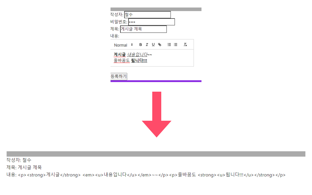 웹 에디터로 작성된 내용은 HTML 태그가 포함된 문자열로 입력되기 때문에, 이를 화면에 출력할 때는 HTML 태그는 노출하지 않으면서 태그의 기능만 적용되도록 처리해야 합니다.